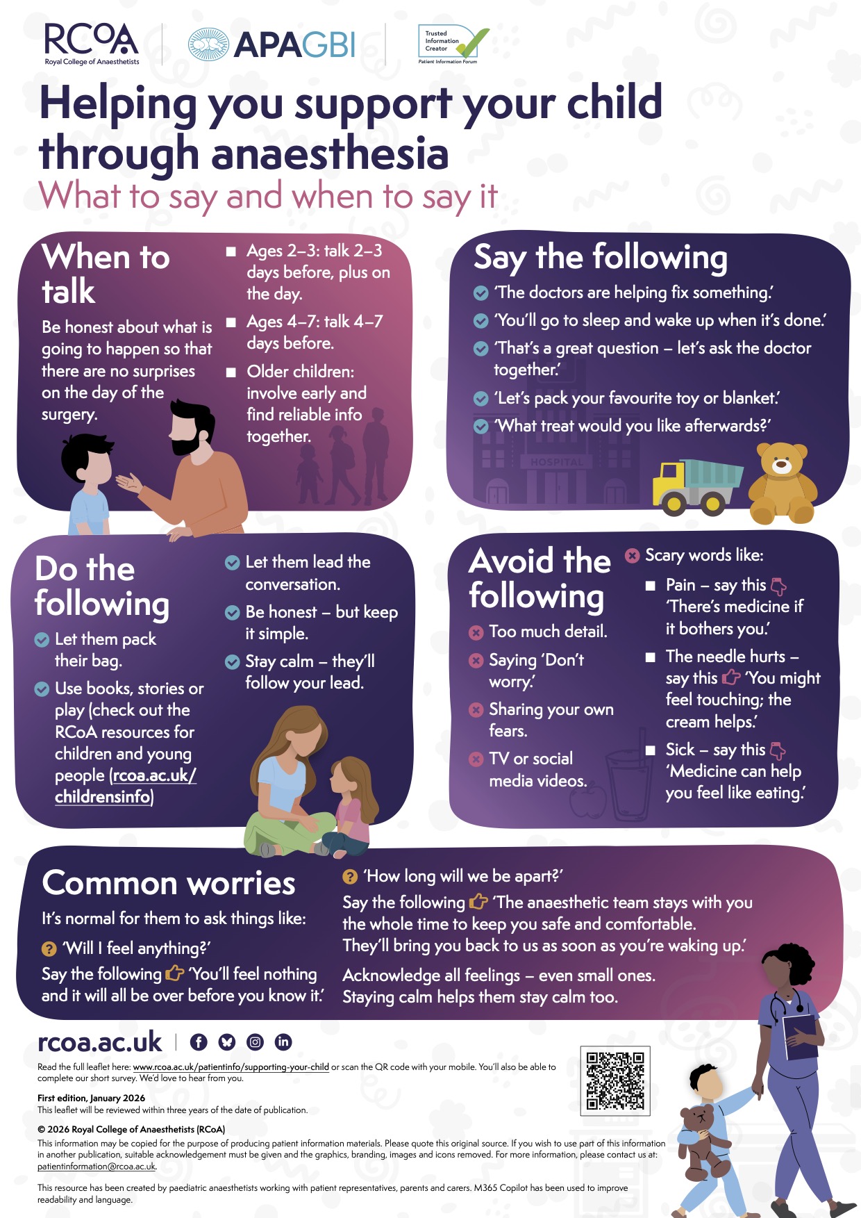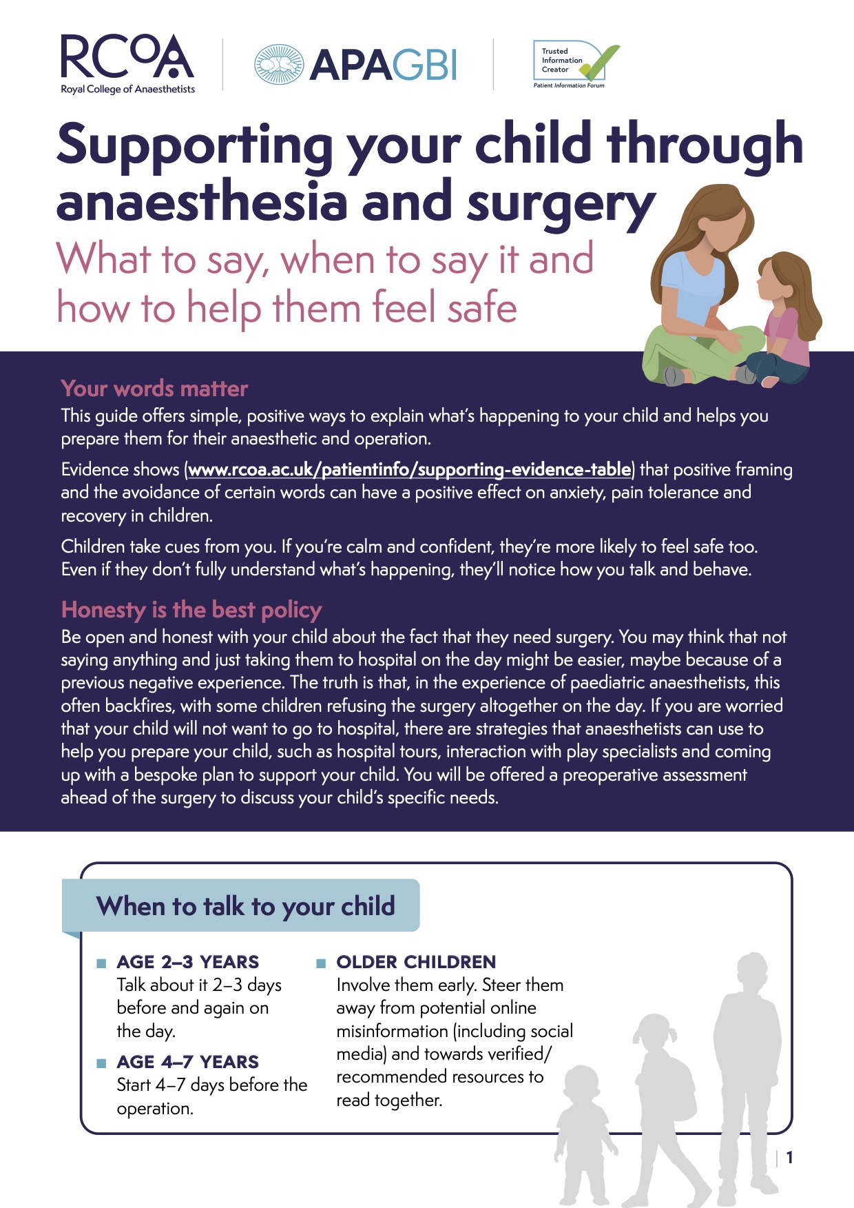 Having surgery and anaesthesia can be worrying for children. This resource is designed to help parents and carers discover strategies and ideas to prepare children mentally for an operation and to help them have a positive experience. They have been produced by The Royal College of Anaesthetists in collaboration with APAGBI.