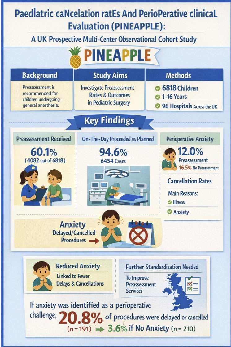 PINEAPPLE is a PATRN and APAGBI collaborative UK Prospective Multi‐Center Observational Cohort Study highlighting the importance of paediatric pre-operative assessment, particularly its role in the reduction of anxiety and potential for reduction in on-the-day cancelation due to intercurrent illness. We hope that this work opens conversations for the further development of paediatric pre-assessment services.